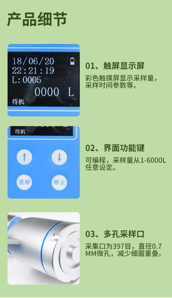在于利用颗粒撞击原理和等速采样理论,通过吸气装置将空气吸入采样器,使空气中的微生物颗粒撞击并附着在收集介质上,涵盖了制药、食品、医疗卫生、环境监测等多个领域。
