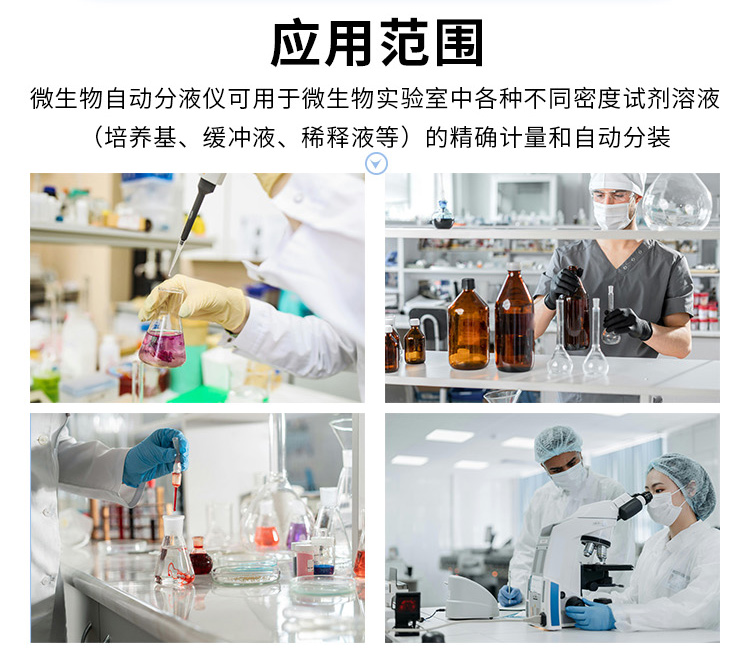 通过柱塞泵抽取试剂进行分液,同时配备清洗液进行清洗,确保分液的准确性和卫生性。适用于食品、药品、政府检测机构及科研单位的专业微生物实验室。